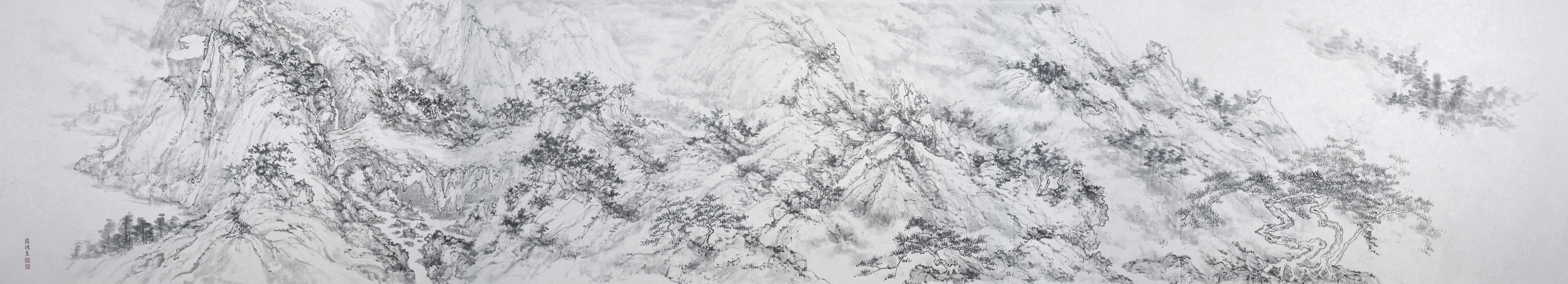 Recently acquired by the CMA, Secluded Valley in the Cold Mountains (2008) embodies Chang’s transformative engagement with abstract expressionism, particularly his response to Pollock’s Number 10. The handscroll begins with serene trees and distant clouds, then explodes into a profusion of lines radiating outward from the rocky mass into space. The darting lines and washes coalesce into mountain forms, balancing spontaneity with control. Chang mirrors the structural rhythm of Number 10’s central black strokes, yet anchors the composition in classical shanshui (“landscape painting”) aesthetics.