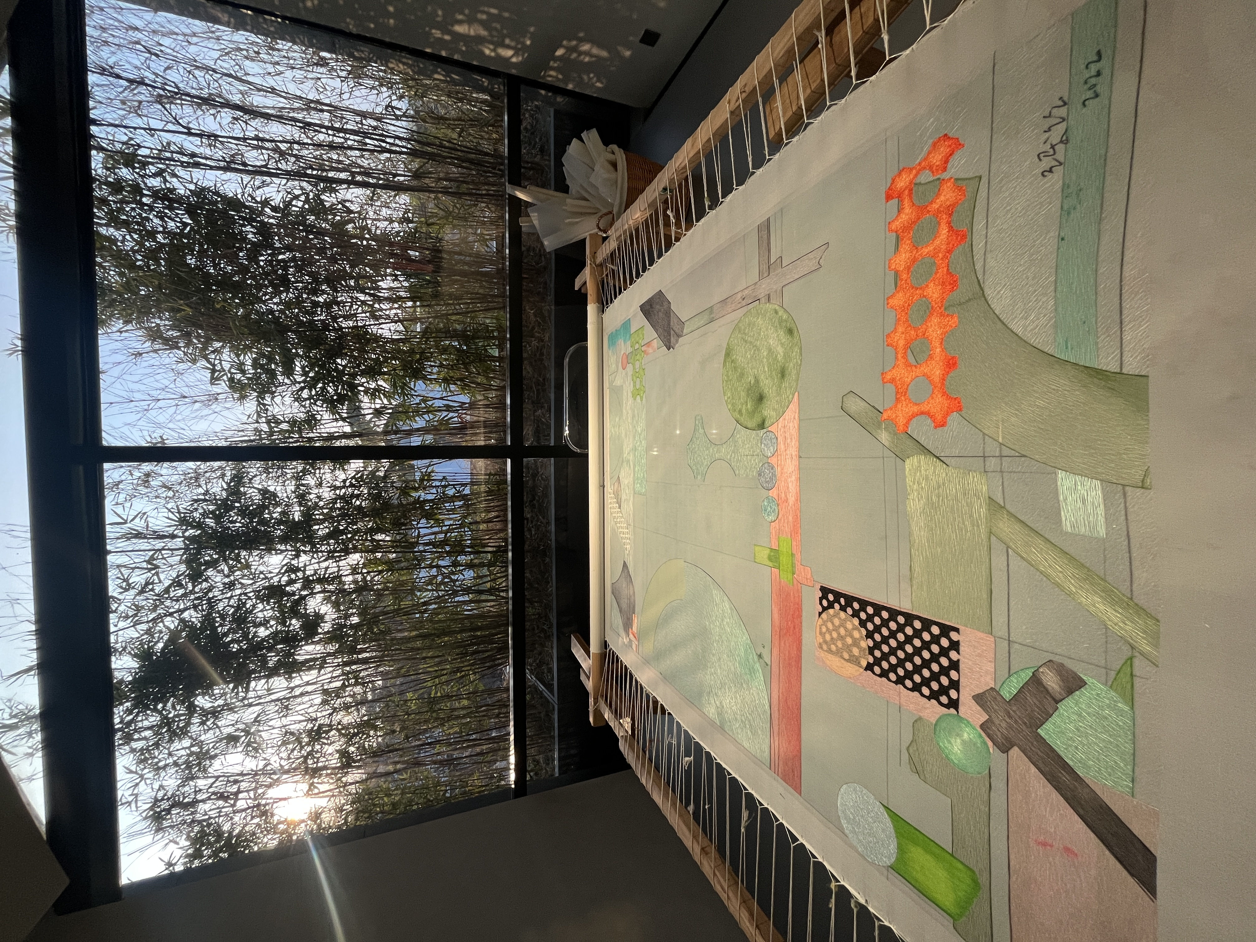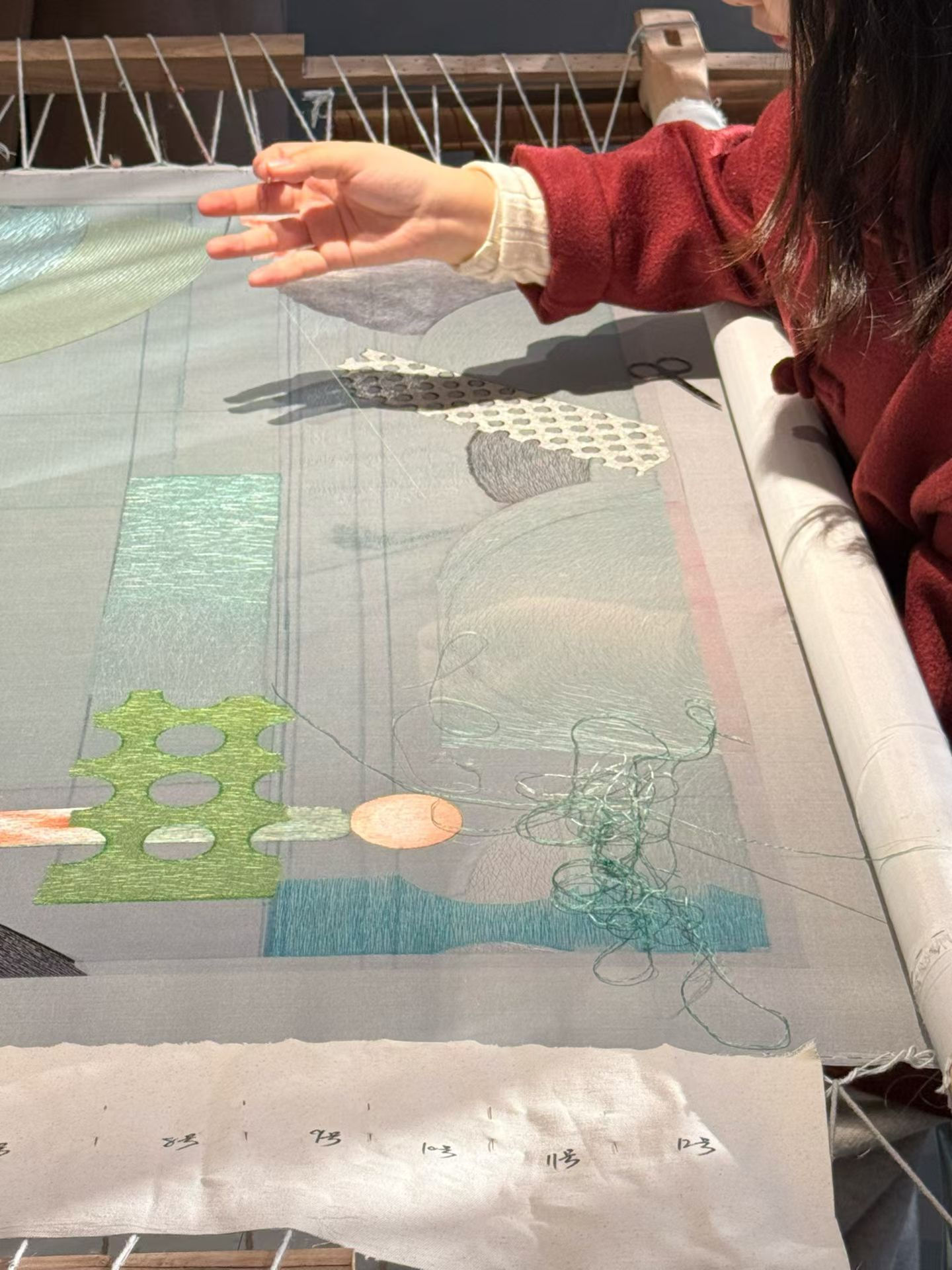 Elsewhere in the exhibition, selected works from the Green series are transformed from two-dimensional compositions into three-dimensional spatial structures, offering viewers a bird’s-eye perspective. A hand-embroidered piece created over several months by Suzhou embroidery artisans is also incorporated into the display. Using needle and thread as a painter’s brush, the work reinterprets Liang Quan’s visual language, bringing the tactile sheen of silk into dialogue with contemporary art. As a nationally recognized form of intangible cultural heritage, Su embroidery here acquires renewed sensory and conceptual depth.