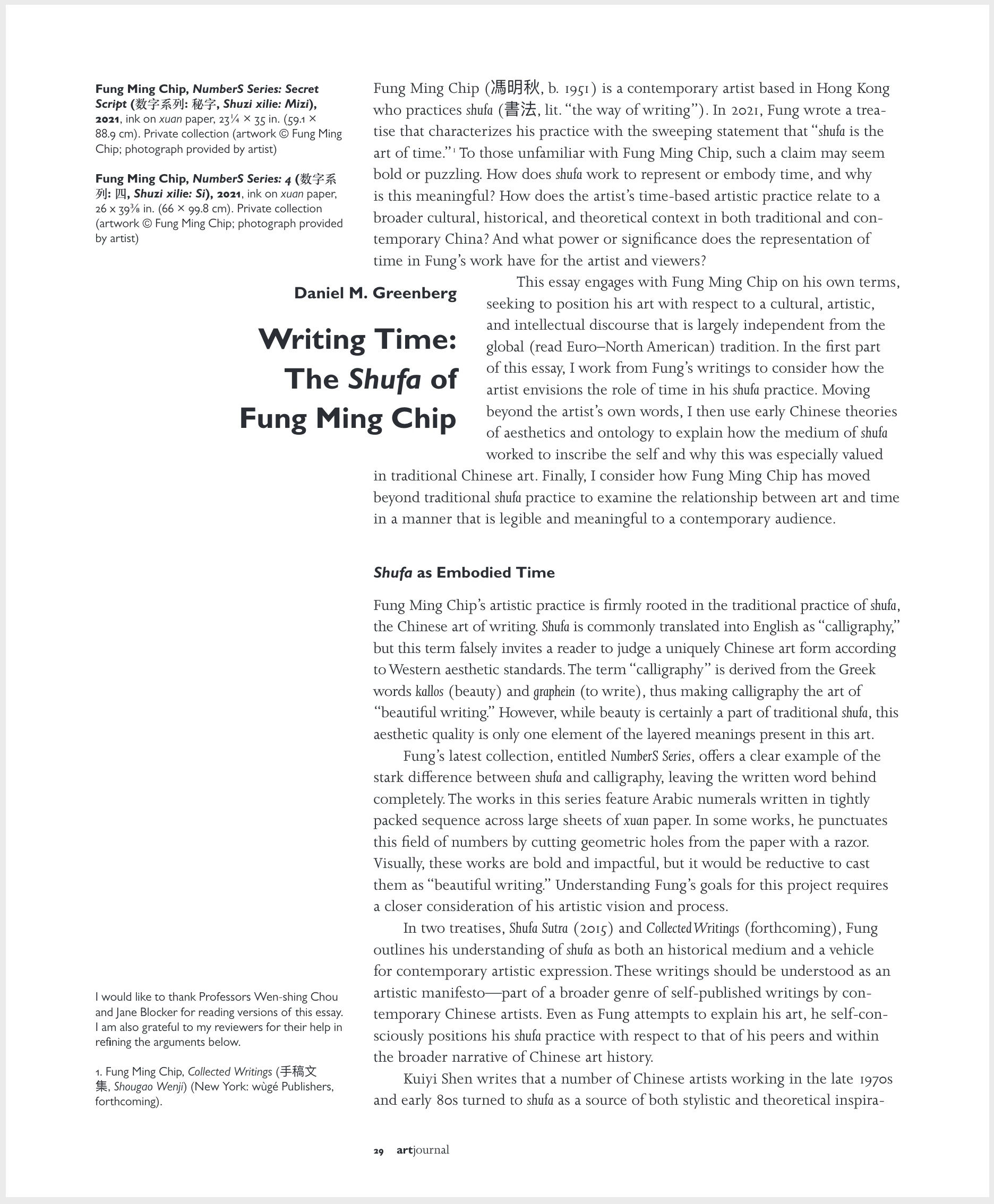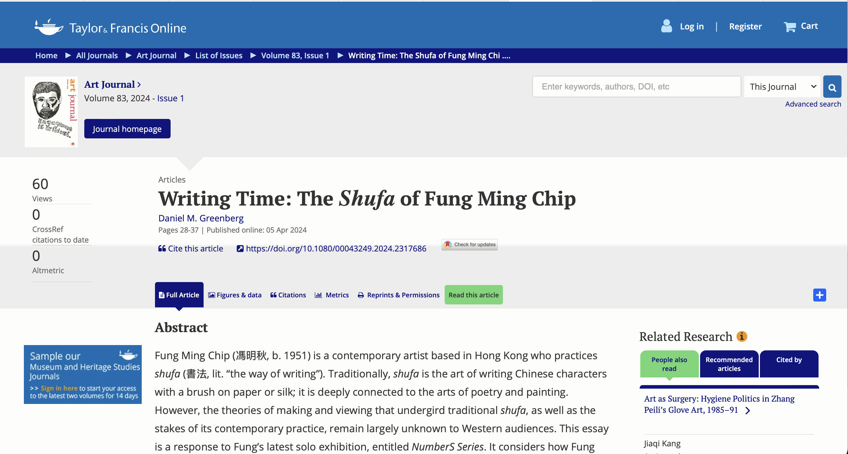 We're delighted to announce the publication of Dr. Daniel Greenberg's research on Fung Ming Chip in Art Journal(CAA), Volume 83, Issue 3 (2024). Art Journal is a prestigious peer-reviewed academic publication of the College Art Association (CAA), established in New York City in 1941, renowned for its critical engagement with 20th and 21st-century art within global frameworks. In contemporary art discourse, the Art Journal (CAA) plays a pivotal role worldwide. They serve as vital conduits for disseminating cutting-edge scholarship and critical analysis across various fields of art history, theory, and practice, fostering rich dialogue within academic and artistic communities.